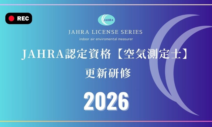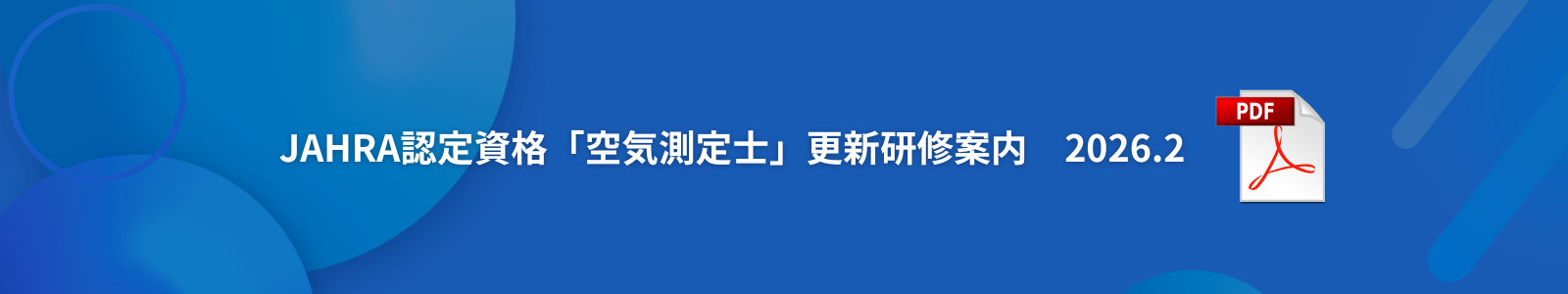 空気測定士の更新は2年毎に実施されますので、該当の方の受講をお願いいたします。今年度から皆様の自由な時間で受講できるよう、アーカイブ配信によるオンデマンド受講となっております。詳細は、JAHRA公式サイト「更新研修」のご案内欄に掲載しています。